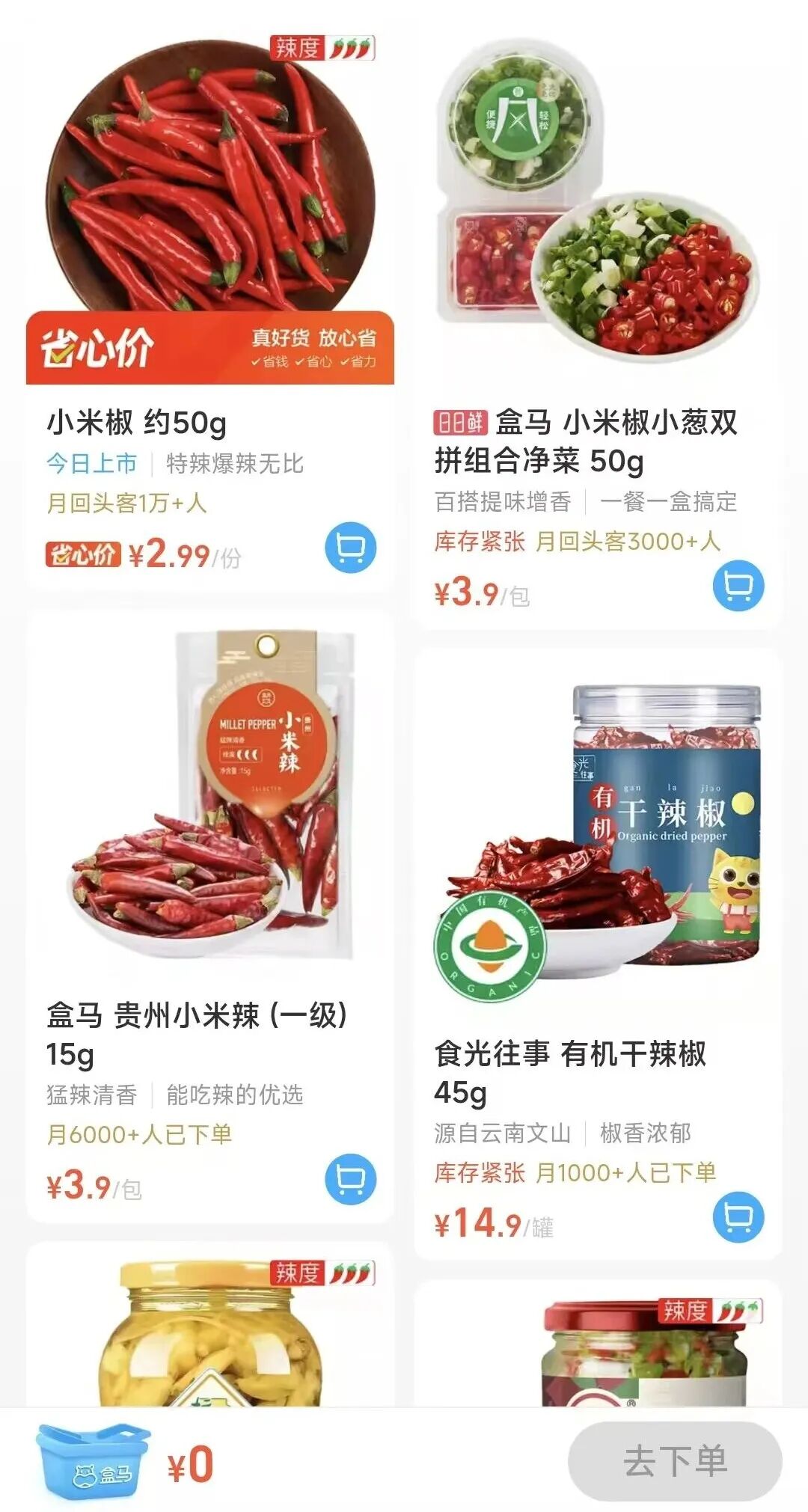 小编在“盒马鲜生”小程序搜索看到,附近一家门店小米辣的价格是2.99元一份,约50克。折算下来,一斤要29.9元。
