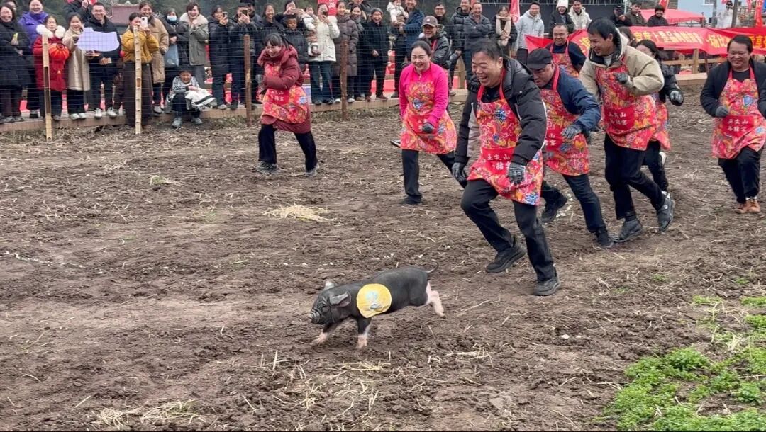 游客毛学平在比赛中成功抓猪,兴奋地表示:“非常刺激,这么多人,就我一个人抓住了,挺幸运的,希望马年行大运!”这项活动不仅让大家找回童趣,更以趣味互动的方式,将五尖山的优质农产品作为奖品直接链接给游客。