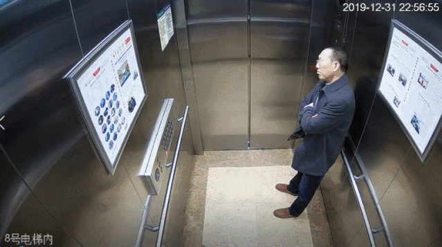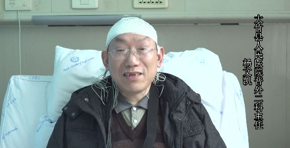 视频中的男子是达州市大竹县人民医院普外二科主任杨文凯,事发当日是12月31日,晚上他查完病房后,从医院13楼坐电梯下负一楼,根据医院8号电梯的监控视频,22:56:55,电梯在13楼关闭,杨医生打了一个大大的“豁嗨”。