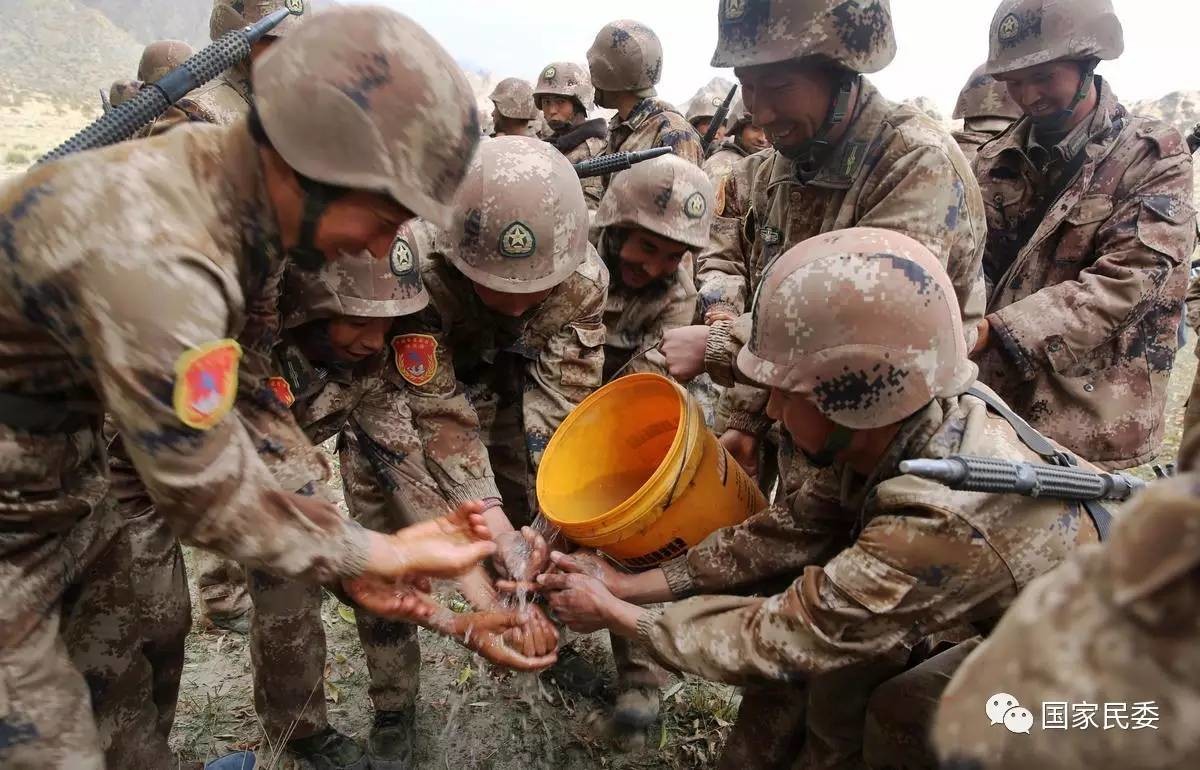一天训练结束,民兵们聚在一起洗手准备吃饭。野外水源稀缺,大家都非常珍惜。