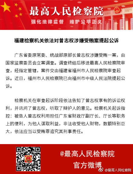 广东省委原常委、统战部原部长曾志权涉嫌受贿一案,由国家监察委员会立案调查。调查终结后移送最高人民检察院审查,经指定管辖,案件交由福建省福州市人民检察院审查起诉。近日,福州市人民检察院已向福州市中级人民法院提起公诉。
