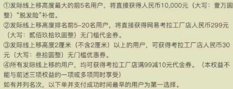 这款“脱发险”的活动规则显示,购买并使用该款洗护发系列商品,精心护发一年,如果使用一年后(以下单之日为起算日,下同)“脱发”严重,最高给予人民币10000元!