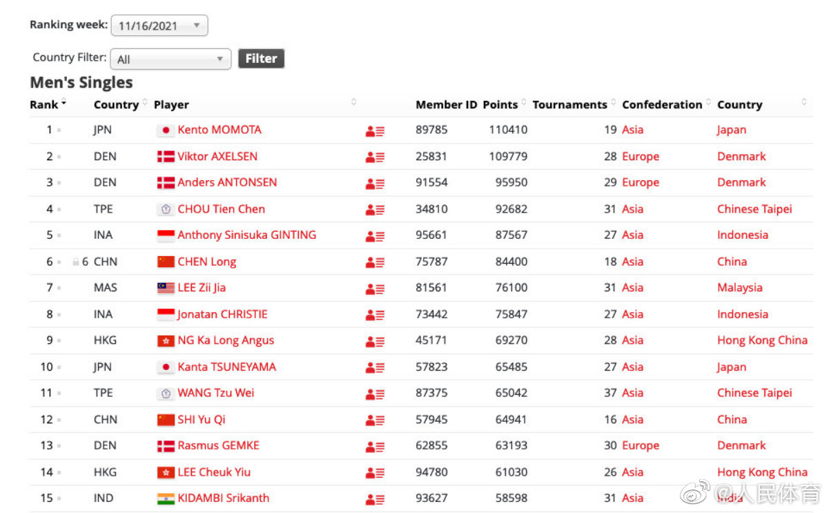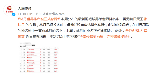 本周公布的最新羽毛球男单世界排名中,再无昔日天王@林丹 的身影,林丹已退役多时,但他并没有申请排名移除,所以他退役后,在世界羽联的排名榜中一直有林丹的名字,本周,林丹的排名正式被移除。 此外,@TAURUS-李俊慧 近日宣布退役,本次男双世界排名中李俊慧刘雨辰世界排名被移除。