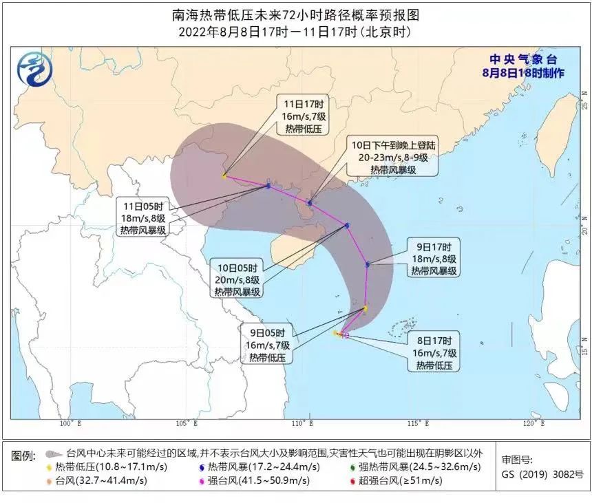 三亚市气象台2022年08月08日17时07分发布台风蓝色预警信号。南海中部海面的热带低压已于8日14时生成,中心附近最大风力7级(16米/秒),17时其中心位于北纬15.5度、东经111.6度, 即在三沙市(西沙永兴岛)西南方向约170公里的南海中部海面上。预计,南海热带低压将先在南海中西部海域回旋,强度变化不大,9日开始转向偏北方向移动,强度缓慢加强,可能于9日加强为今年第7号台风,最大强度可达热带风暴级(8~9级,20~23米/秒),将于10日下午至晚上在海南岛东北部至广东西部一带沿海登陆,登陆时为热带风暴级(8~9级,20~23米/秒)。