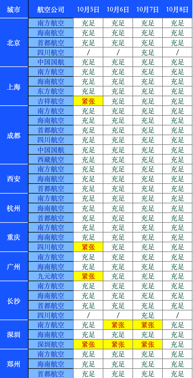 以下为10月5日-8日部分重点客源地城市航班余票情况,目前三亚出港航班均有部分余票,未出现机票售罄情况,希望能为您的出行计划提供参考: