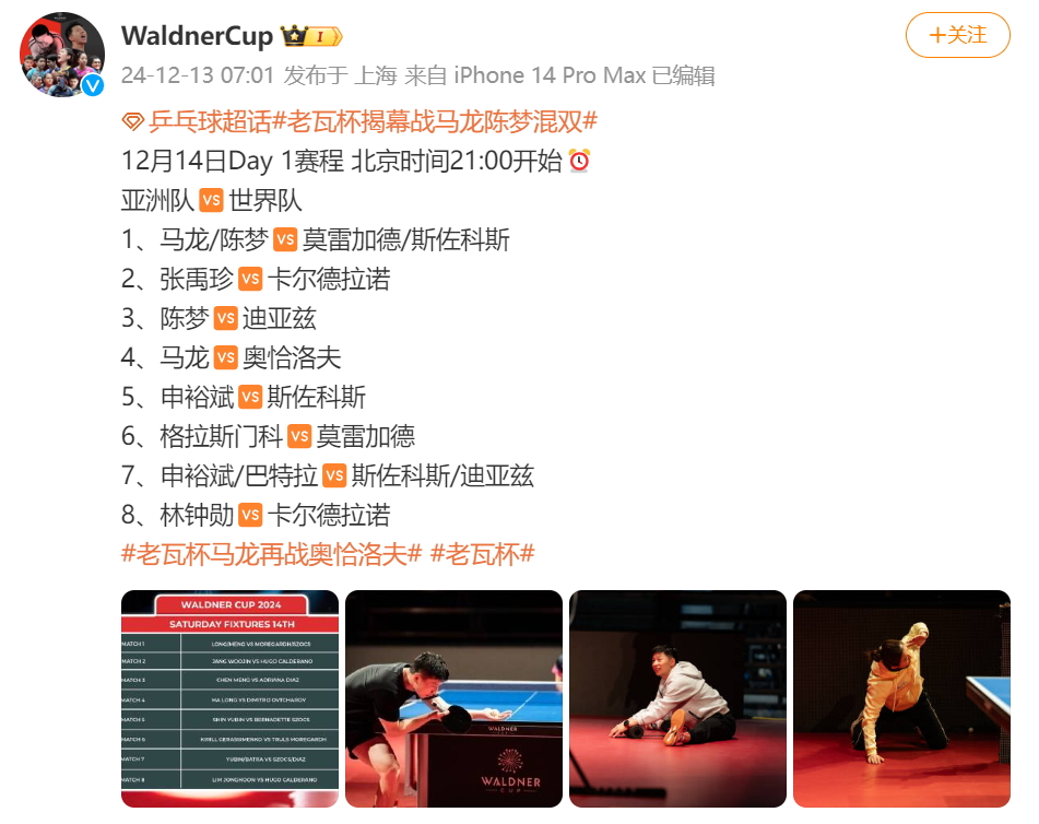 老瓦杯揭幕战今天打响,马龙、陈梦出战混双,对阵莫雷加德、斯佐科斯,比赛将于14日21:00开始。