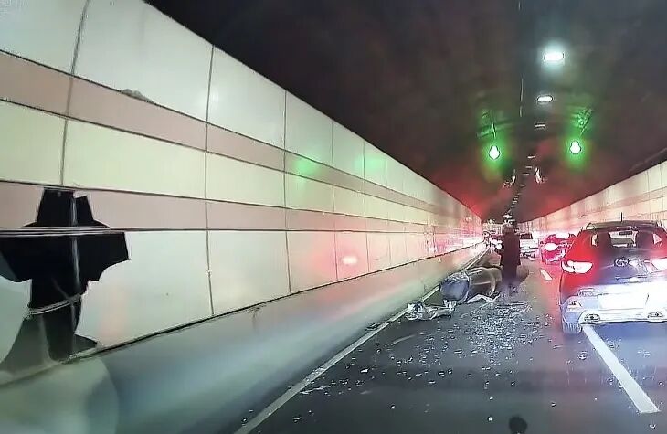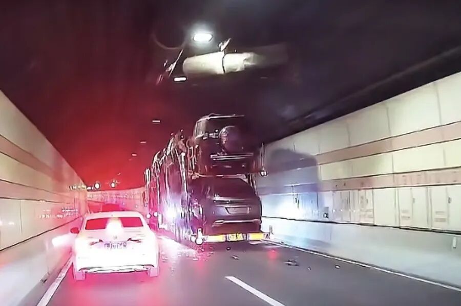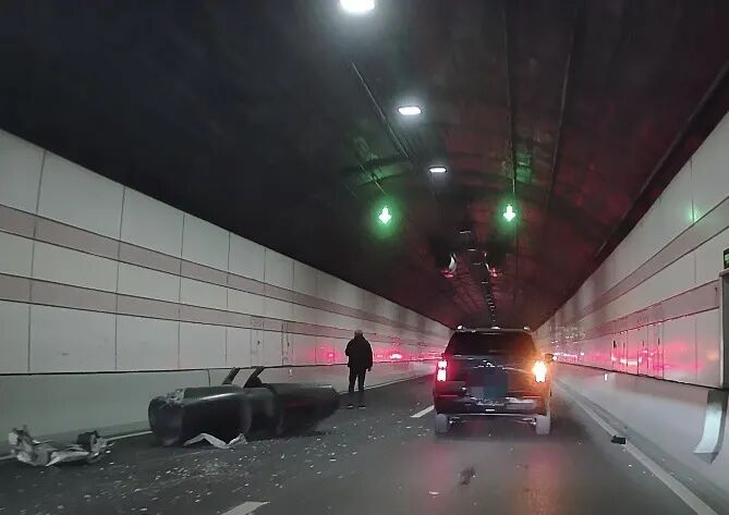 不料,在驶入隧道后不久,涉事车辆上装载的车辆因超高,撞击到了隧道顶部设施设备,隧道内顿时飘散出一阵灰尘。伴随着灰尘,隧道顶部一台大型风机应声掉落在左侧车道上。