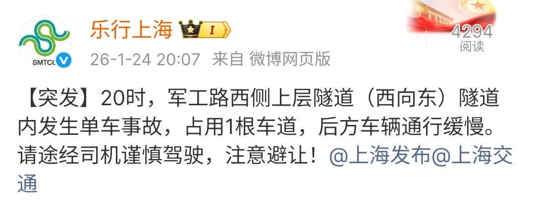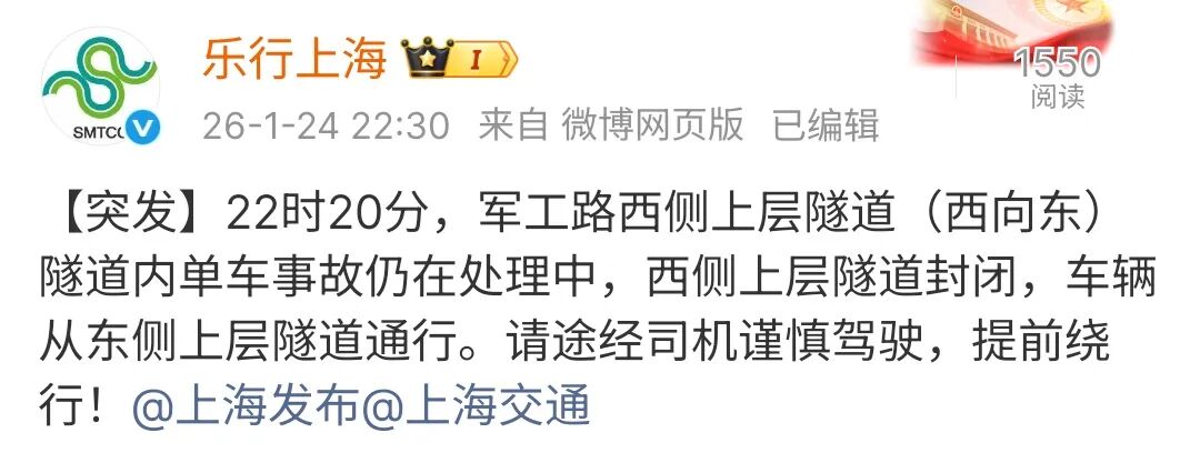 接报后,交警和隧道管养人员到场。交警对军工路隧道浦西往浦东方向上层隧道入口采取交通管制措施。
