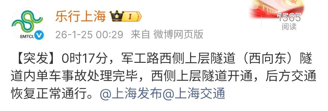 军工路西侧上层隧道一度封闭