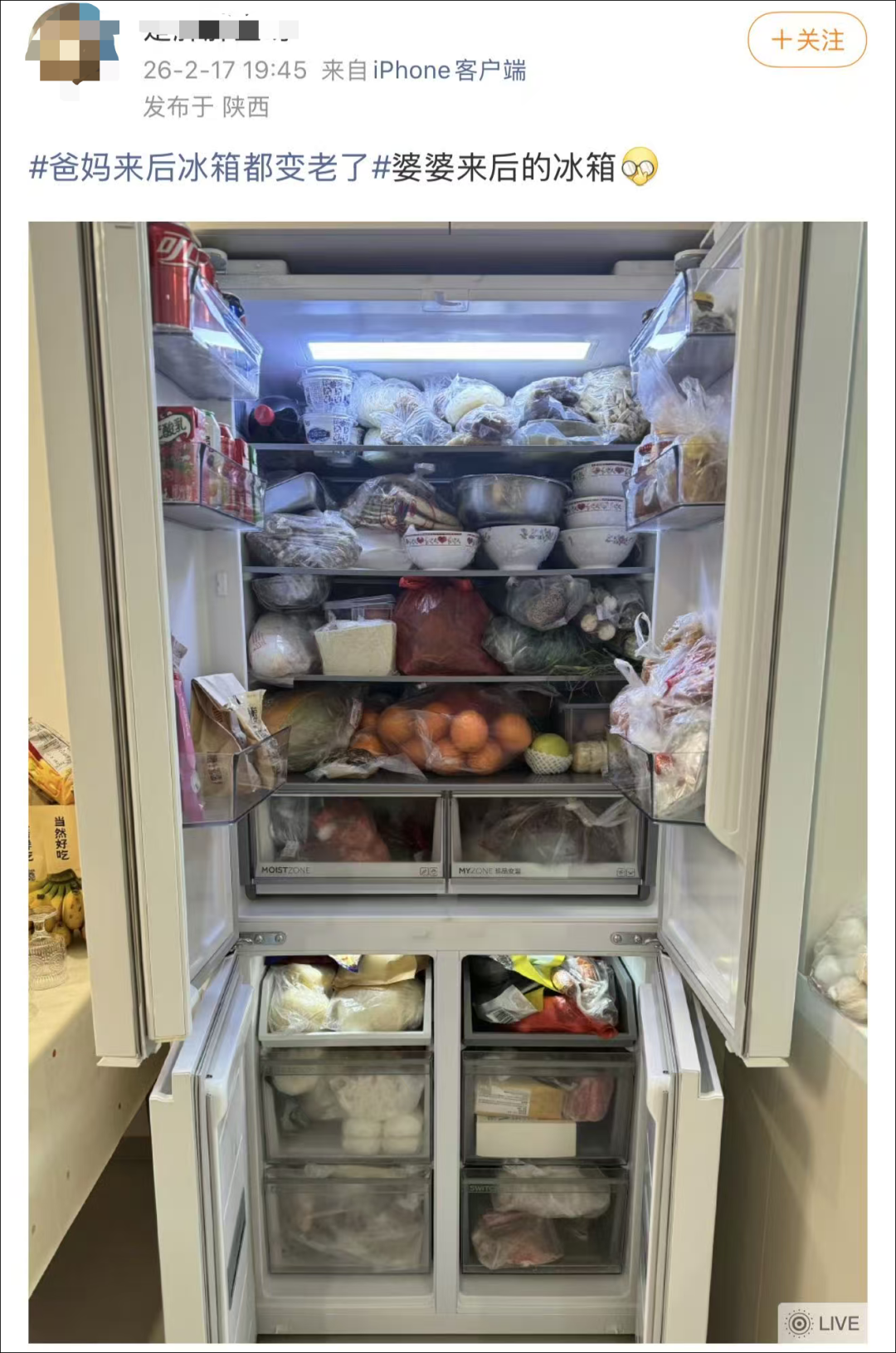 2月17日,“爸妈来后冰箱都变老了”冲上热搜,网友纷纷晒同款并感慨:“原来全国都这样!”