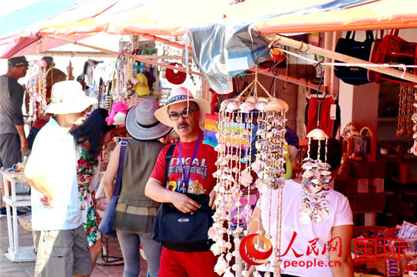 通幽,绿树红花、奇石雕塑,别有天地。在花园里拍婚纱照的新人,脉脉含情,正在享受人生的美好时刻。山下广场摆满摊档,商品琳琅满目,做工精细的银饰、图案独特的文化衫、多彩的骑士大沿帽……这些具有浓郁墨西哥民族特色的商品吸引着过往的游客。
