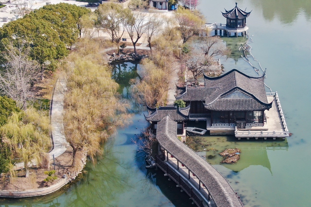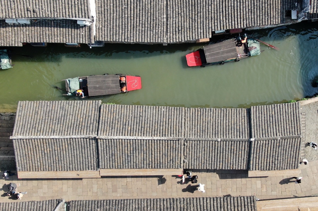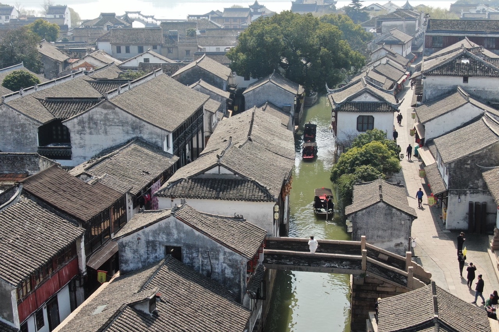 2023年3月4日,江苏省苏州市,航拍昆山市西南的锦溪古镇,游船在水中驶过。锦溪古镇有着2500多年的悠久历史,卵石小巷、明清楼堂、白墙黛瓦……完整保持了“小桥、流水、人家”的江南水乡风貌。近年来,锦溪镇始终坚持把古镇保护性发展作为重要工作来谋划,在原汁原味保留古镇风貌、韵味、肌理的同时,不断推进古镇有机更新和精细管理,让千年古镇更好地焕发历史魅力和时代新颜。(无人机照片) 中新社记者 泱波 摄