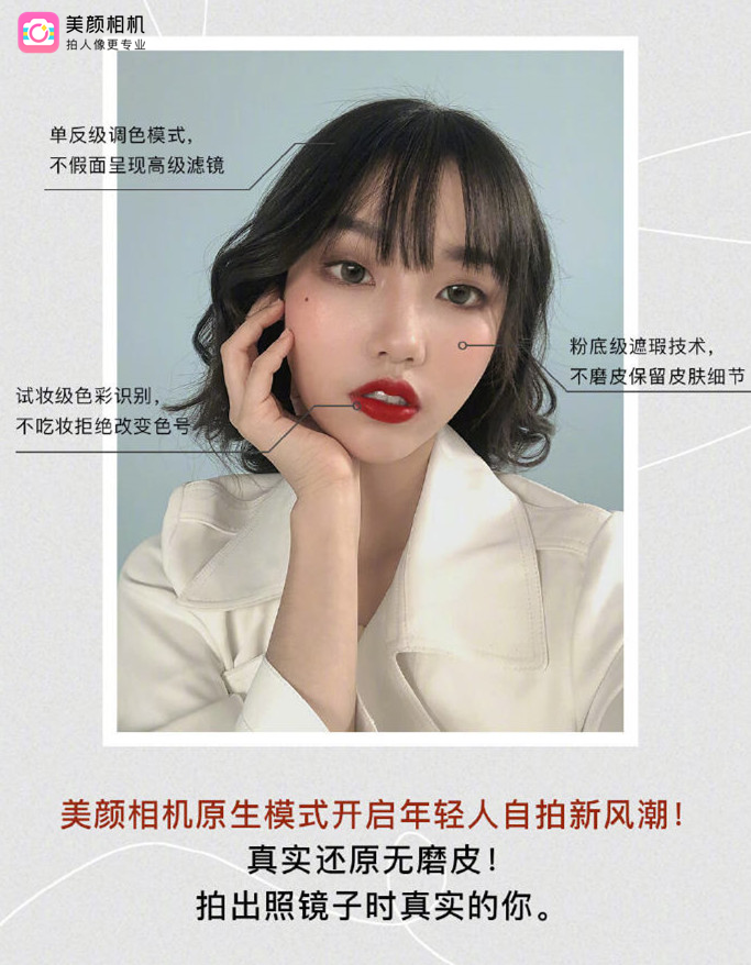 为了迎合这届年轻人的拍照需求,在2019年第三季度,美颜相机上线了泪痣效果,这款效果的底妆实际上是一种保留面容特点和皮肤质感的做法。泪痣效果很快获得了年轻人的喜爱,这启发美颜相机团队开发出了行业内首个自拍“原生模式”,通过对算法的调校,能令原生模式拍出照镜子般的质感生图。