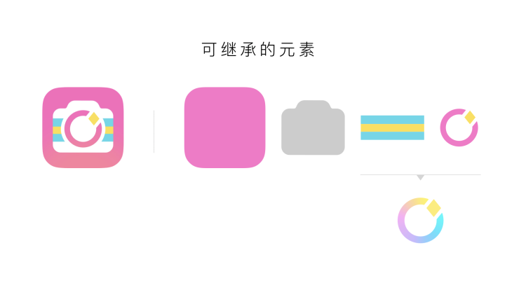 为了保证美颜相机的品牌DNA的延续,设计师拆解出如“粉色”,“相机”, “彩色条”,“镜头”等用户印象深刻的视觉元素,针对当前年轻用户的喜好,将他们重新组合升级并传承到新的logo上。