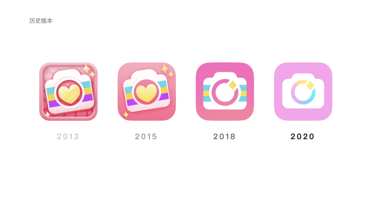 此前美颜相机已经进行了多次的进化,在这次的品牌升级过程中设计师用了3个关键词总结美颜相机的新LOGO的:年轻、简单、渐变。