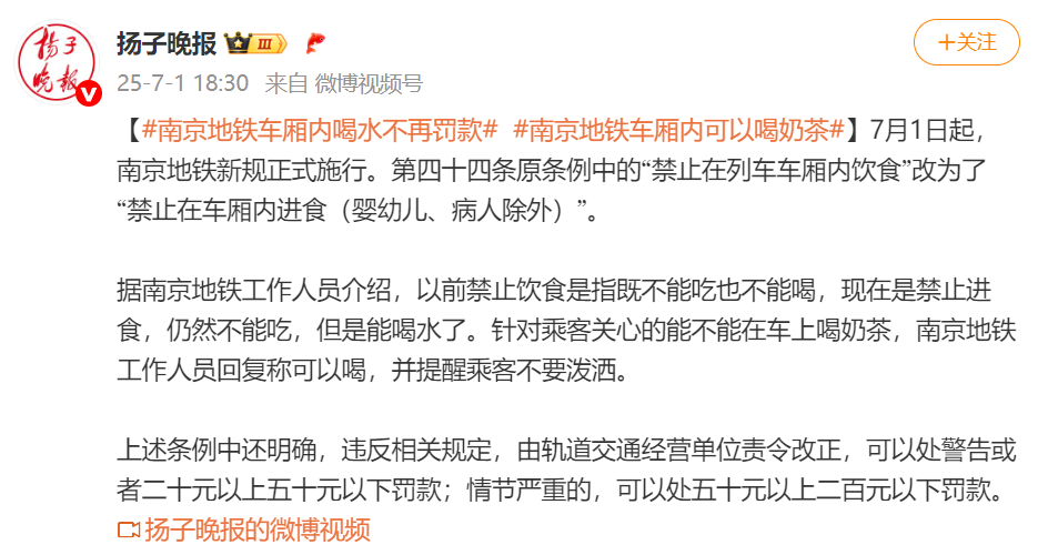 南京地铁新规正式施行,车厢内喝水不再罚款