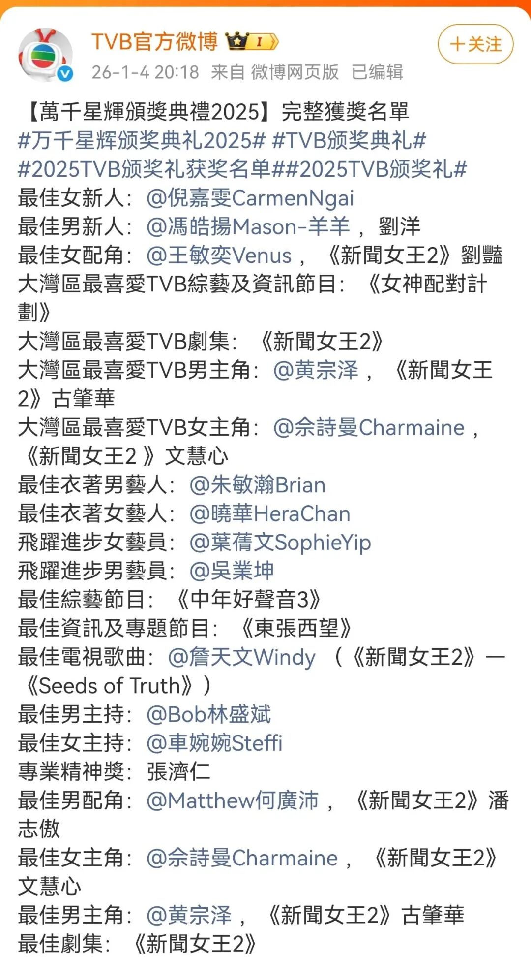 1月4日晚,TVB万千星辉颁奖典礼举行,这场备受港剧迷瞩目的盛会诞生多个重磅奖项。