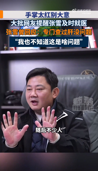 4月3日,“手掌太红大批网友提醒张雪及时就医”登上热搜引热议,据大象新闻报道,“张雪机车”近日爆火,有网友注意到张雪的手掌太红,不少人猜测可能是“肝掌”,有人劝张雪及时就医。