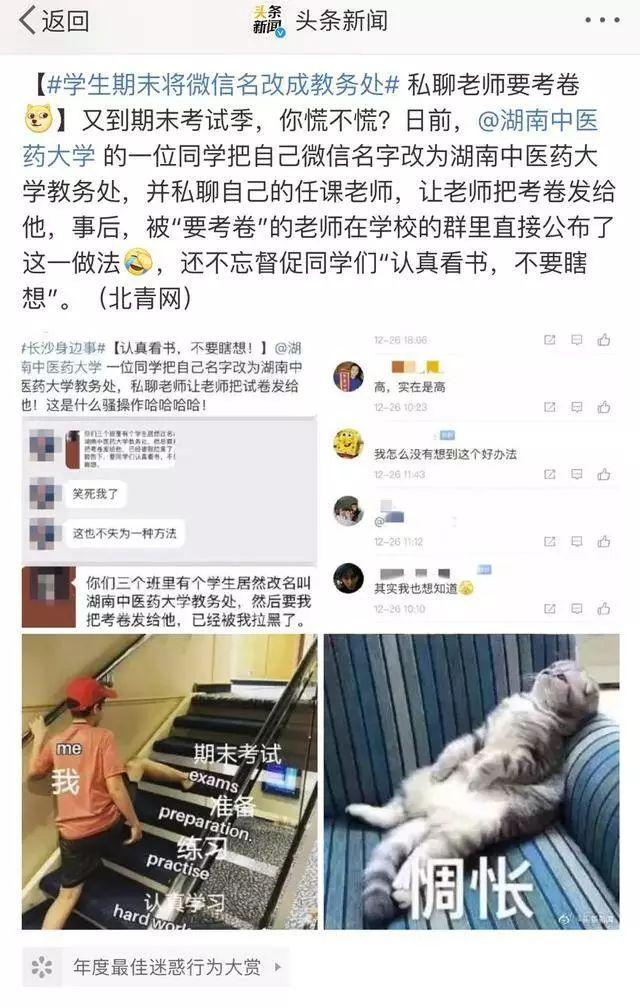 当然还有奇葩新闻也来“冲业绩”!湖南中医药大学的一位同学把自己微信名字改为湖南中医药大学教务处,并私聊自己的任课老师,让老师把考卷发给他,事后,被“要考卷”的老师在学校的群里直接公布了这一做法。