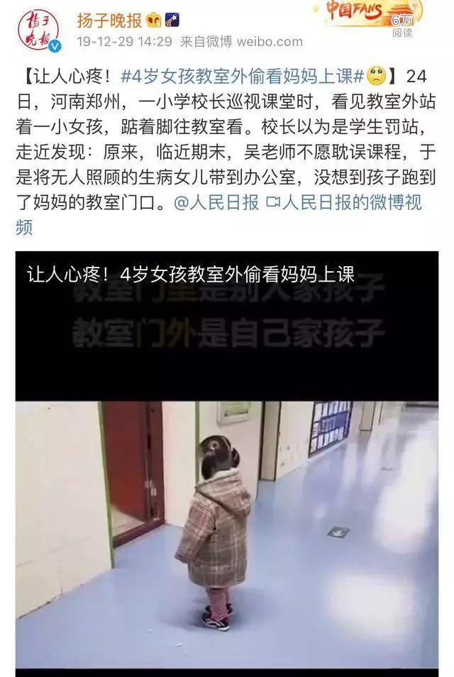 还有河南一位老师因为临近期末,不愿意耽误课程,将无人照顾的生病女儿带到办公室。4岁女儿教室外偷看妈妈上课,引来无数网友心疼。