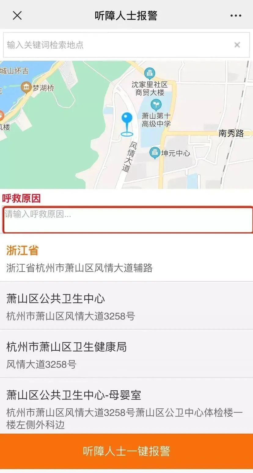 然后,点击“听障人士报警” ,也可根据实际需求选择“为自己报警”“为亲友报警”或“为陌生人报警”等;按照提示填写“呼救原因”并选择定位地址,再点击“听障人士一键报警”,完成呼救报警。