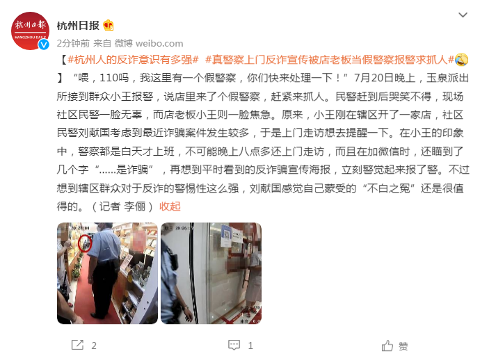 “喂,110吗,我这里有一个假警察,你们快来处理一下!”7月20日晚上,玉泉派出所接到群众小王报警,说店里来了个假警察,赶紧来抓人。民警赶到后哭笑不得,现场社区民警一脸无辜,而店老板小王则一脸焦急。原来,小王刚在辖区开了一家店,社区民警刘献国考虑到最近诈骗案件发生较多,于是上门走访想去提醒一下。在小王的印象中,警察都是白天才上班,不可能晚上八点多还上门走访,而且在加微信时,还瞄到了几个字“……是诈骗”,再想到平时看到的反诈骗宣传海报,立刻警觉起来报了警。不过想到辖区群众对于反诈的警惕性这么强,刘献国感觉自己蒙受的“不白之冤”还是很值得的。(记者 李俪)