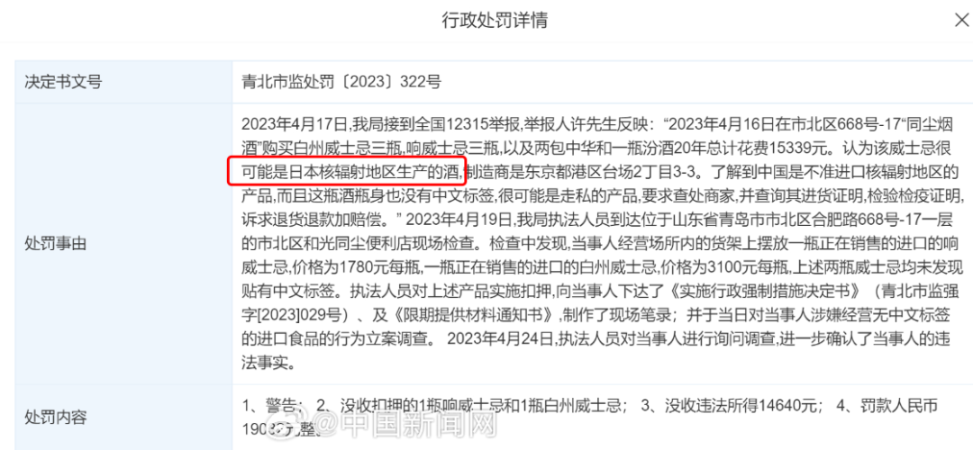青岛市市北区和光同尘便利店因涉嫌销售日本核辐射地区生产的威士忌酒被罚款1.9万余元,没收违法所得1.4万余元。经查,当事人经营场所内的货架上摆放一瓶正在销售的进口的威士忌,一瓶正在销售的进口的白州威士忌,上述两瓶威士忌均未发现贴有中文标签,据投诉该威士忌产自日本核辐射地区。