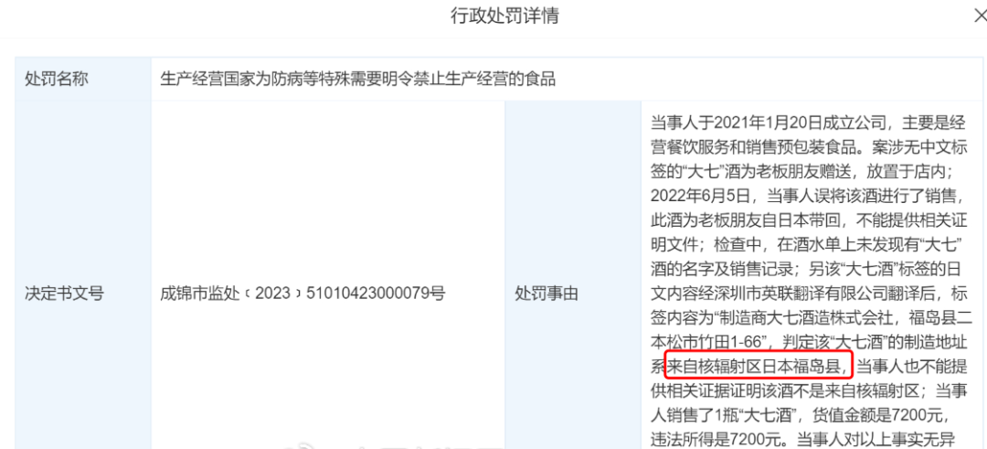 2023年3月,成都某餐饮有限公司因销售核辐射区酒类产品被锦江市场监督管理局罚款3万元。经查,案涉无中文标签的“大七酒” 为老板朋友赠送,放置于店内,后期误将该酒进行了销售,此酒为老板朋友自日本带回,不能提供相关证明文件;另该“大七酒”标签的日文内容经翻译后,标签内容为“制造商大七酒造株式会社,福岛县二本松市竹田1-66”,判定该“大七酒”的制造地址系来自核辐射区日本福岛县 ,当事人也不能提供相关证据证明该酒不是来自核辐射区。