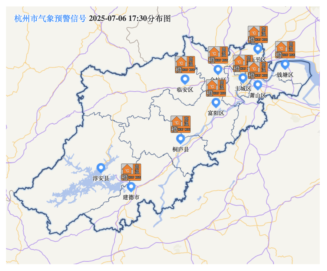 杭州市气象台2025年07月06日08时43分发布高温橙色预警信号。截至今日17:30,杭州仍有多个地区发布高温橙色预警信号,请注意做好防暑降温工作。