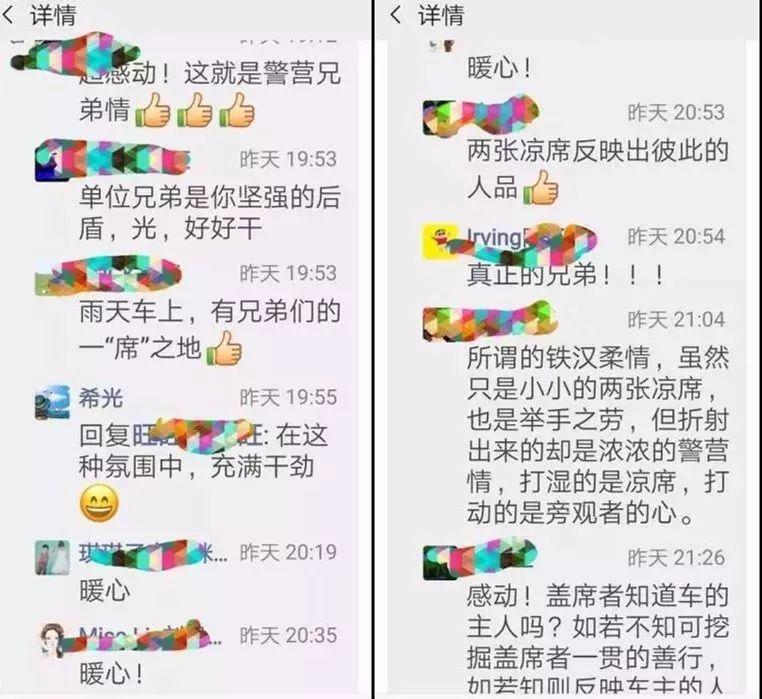 经了解,凉席的主人分别是刑侦中队的协警卢津琪和金伟波等。当看到洪希光发的这条微信后,长洪希光6岁的金伟波留言调侃:“我鞋子也湿了,回来红牛一瓶!”