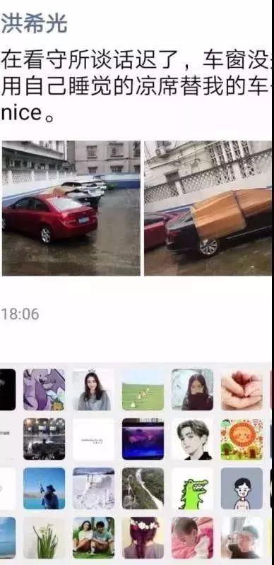 暖心,感动,如这暴雨,来得猝不及防!当下,洪希光在朋友圈发了这样一条微信:在看守所谈话迟了,车窗没关,单位兄弟主动用自己睡觉的凉席替我的车子遮风挡雨,很nice。