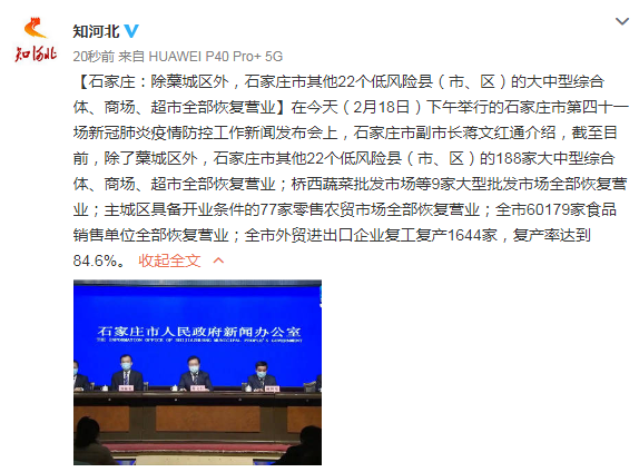 【石家庄:除藁城区外,石家庄市其他22个低风险县(市、区)的大中型综合体、商场、超市全部恢复营业】在今天(2月18日)下午举行的石家庄市第四十一场新冠肺炎疫情防控工作新闻发布会上,石家庄市副市长蒋文红通介绍,截至目前,除了藁城区外,石家庄市其他22个低风险县(市、区)的188家大中型综合体、商场、超市全部恢复营业;桥西蔬菜批发市场等9家大型批发市场全部恢复营业;主城区具备开业条件的77家零售农贸市场全部恢复营业;全市60179家食品销售单位全部恢复营业;全市外贸进出口企业复工复产1644家,复产率达到84.6%。