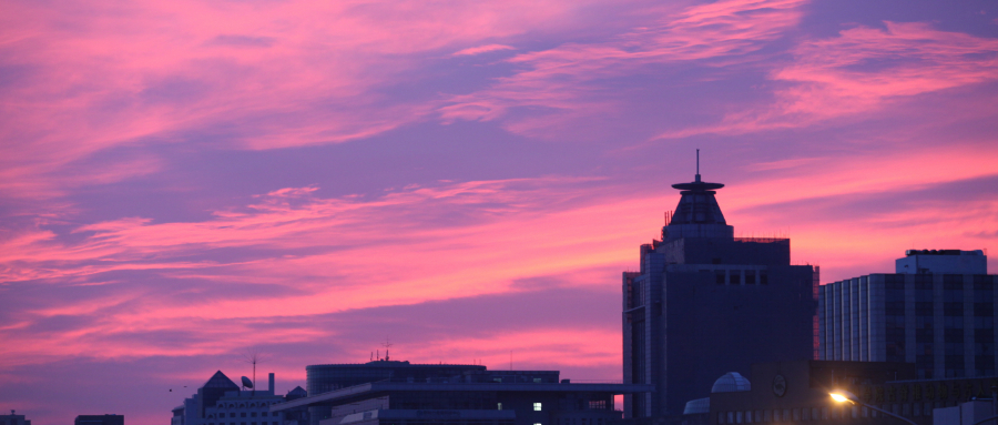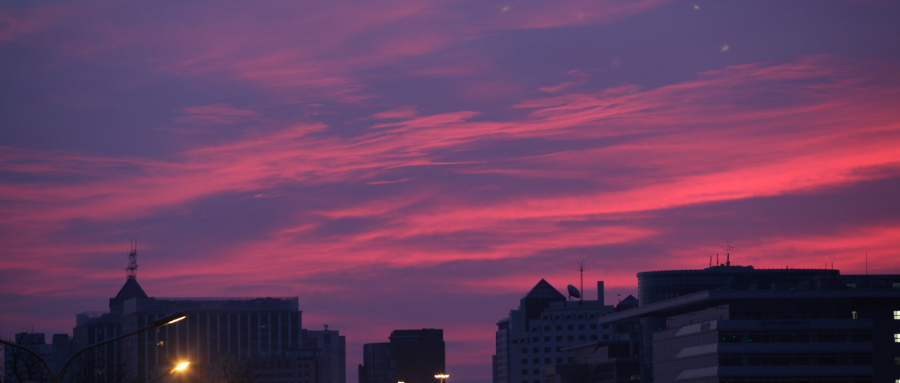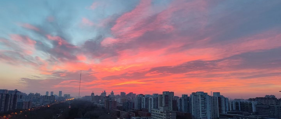 19日早晨,北京天空出现大片粉色超霞,映出半边橙红天空!让这超惊艳朝霞开启你元气满满的一天,你有拍到吗?(王晓/摄)
