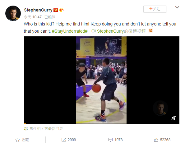 NBA金州勇士队后卫斯蒂芬·库里发布微博寻找视频中打篮球的独臂少年,他在微博中写道:“这位孩子是谁?帮我找到他!坚持做你自己,并不要让别人说你不行。(Who is this kid? Help me find him! Keep doing you and don't let anyone tell you that you can't。)”