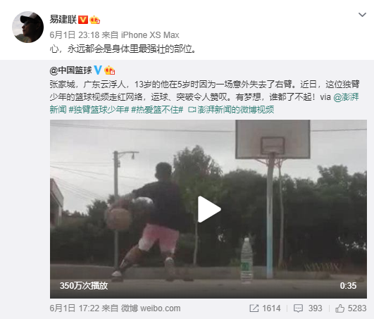 易建联在其微博上转发了张家城的视频并写道:“心,永远都会是身体里最强壮的部位。”以此表达对于这位少年的肯定和鼓励。