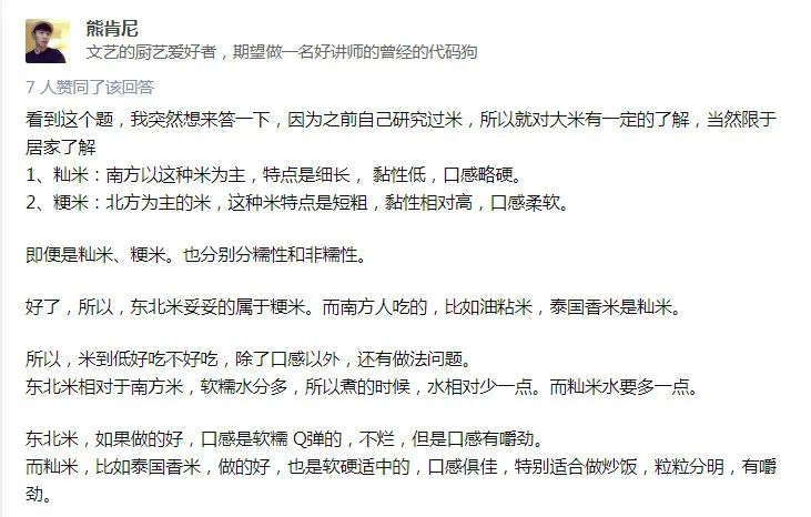这一提问下,文艺的厨艺爱好者“熊肯尼”说,南方米和北方米,其实各有各的好,主要是运用得当。