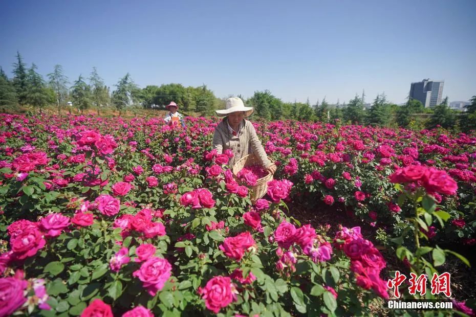 4月20日,工作人员采摘玫瑰花。中新社记者 刘冉阳 摄