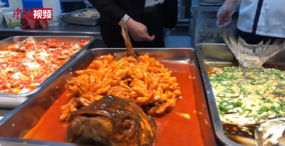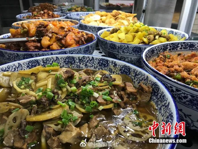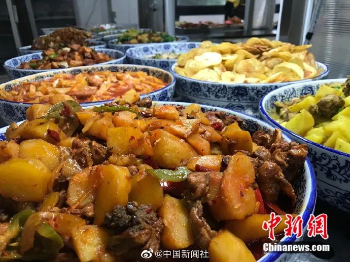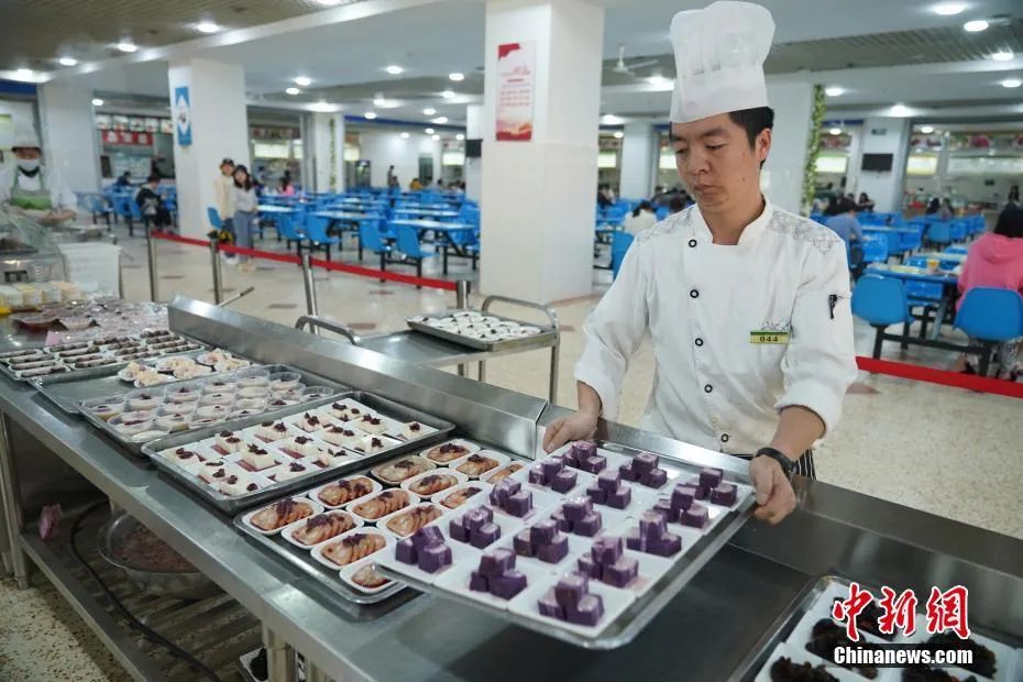 4月20日,食堂工作人员端上刚做好的美食。中新社记者 刘冉阳 摄