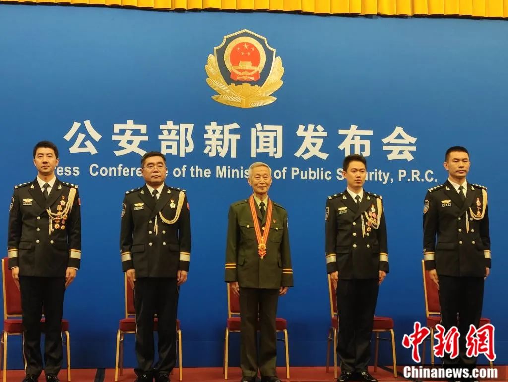 “七一勋章”获得者崔道植(中)出席公安部新闻发布会。公安部供图
