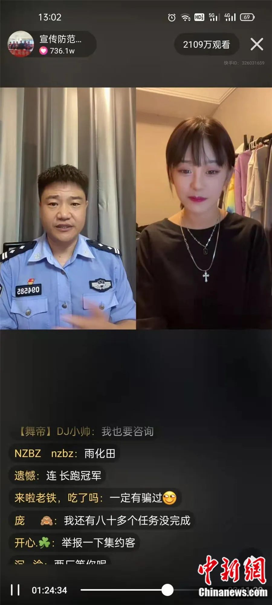 图为反诈警察陈国平在网络直播中与主播连线宣传反诈知识。网络截图