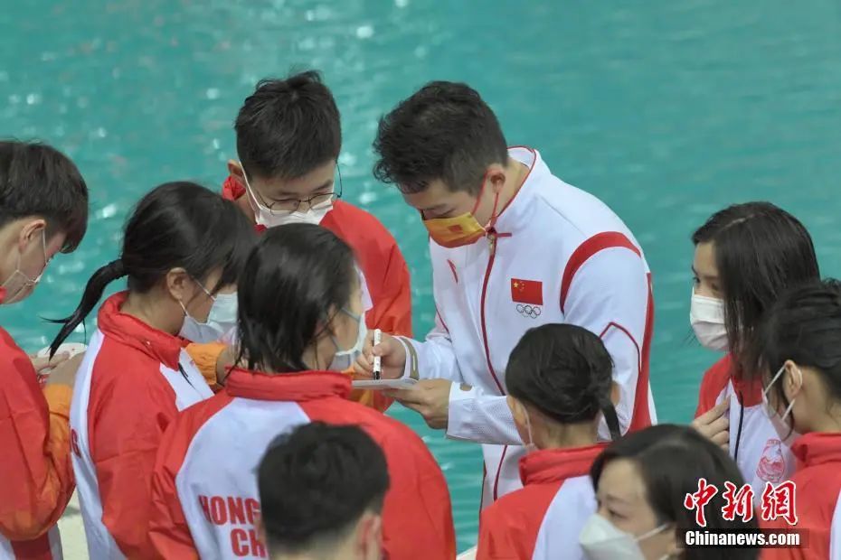 12月4日上午,内地奥运健儿代表团的部分运动员来到香港铜锣湾维多利亚公园游泳池,向现场观众示范表演跳水及游泳运动,展示奥运健儿风采。图为跳水运动员王宗源为香港运动员签名。中新社记者 李志华 摄