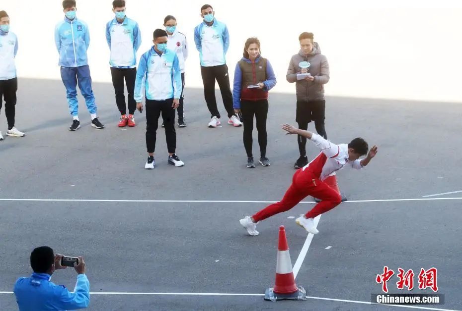 12月4日,内地奥运健儿访港代表团部分运动员在香港消防及救护学院,与香港纪律部队成员交流。图为李发彬再秀“金鸡独立”。中新社记者 张宇 摄
