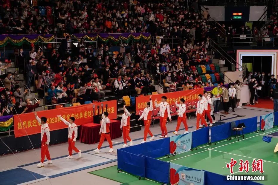 12月4日上午,内地奥运健儿代表团的部分运动员来到香港伊利沙伯体育馆,向现场观众示范表演体操、蹦床、羽毛球、击剑、乒乓球等项目。图为内地奥运健儿向现场观众挥手致意。中新社记者 张炜 摄