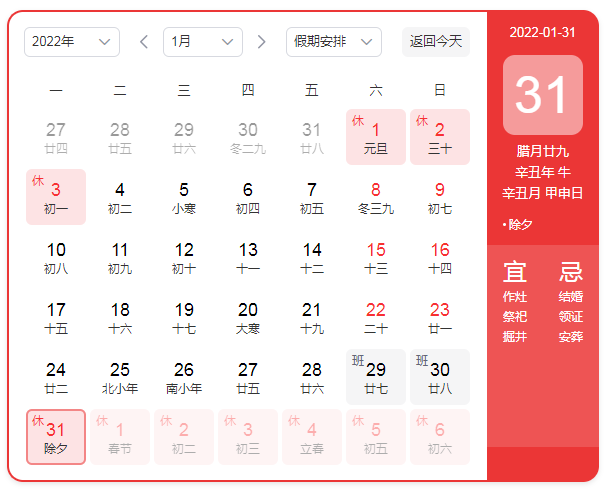 临近年末,距离2022年春节也只有一个多月了。然而,翻开日历却发现,2022年1月31日是农历腊月二十九,2月1日便是大年初一。