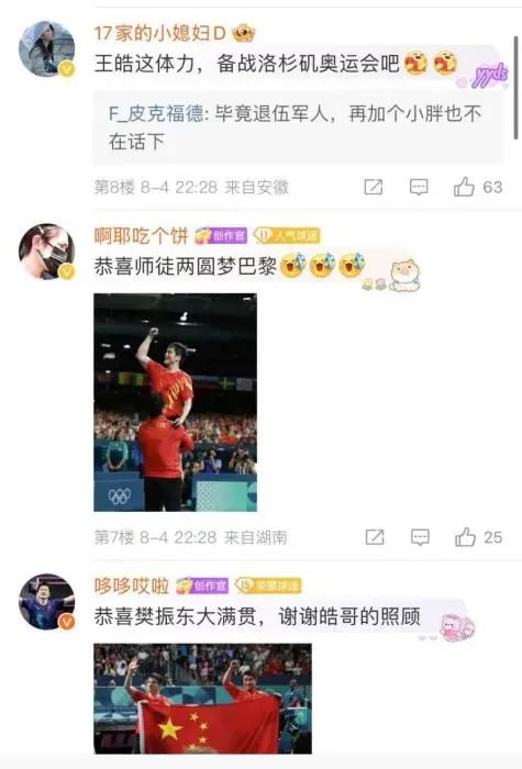 “王皓一下把樊振东抱起来说明什么?说明40岁正是该闯的年纪!”“王皓你下一届练举重吧!”“王皓这体力,准备备战下一届奥运会吧!”网友被师徒二人圆梦瞬间感动之余,忍不住调侃。