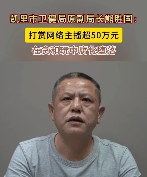 11月26日,贵州省纪委监委发布短视频《失守|凯里市卫健局原副局长熊胜国:在贪和玩中腐化堕落》,披露贵州凯里市卫健局原副局长熊胜国违纪违法细节,其中提到熊胜国将大部分收受的好处费用于打赏网络主播,而其打赏网络女主播花费超50万元。