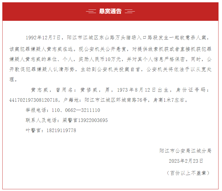 2月23日,南都记者获悉,广东阳江市公安局江城分局发布悬赏通告称,1992年12月7日,阳江市江城区东山路万头猪场入口路段发生一起故意杀人案,该案犯罪嫌疑人黄志威在逃。现公安机关公开悬赏,对提供线索抓获或者直接抓获犯罪嫌疑人黄志威的单位、个人,奖励人民币10万元。