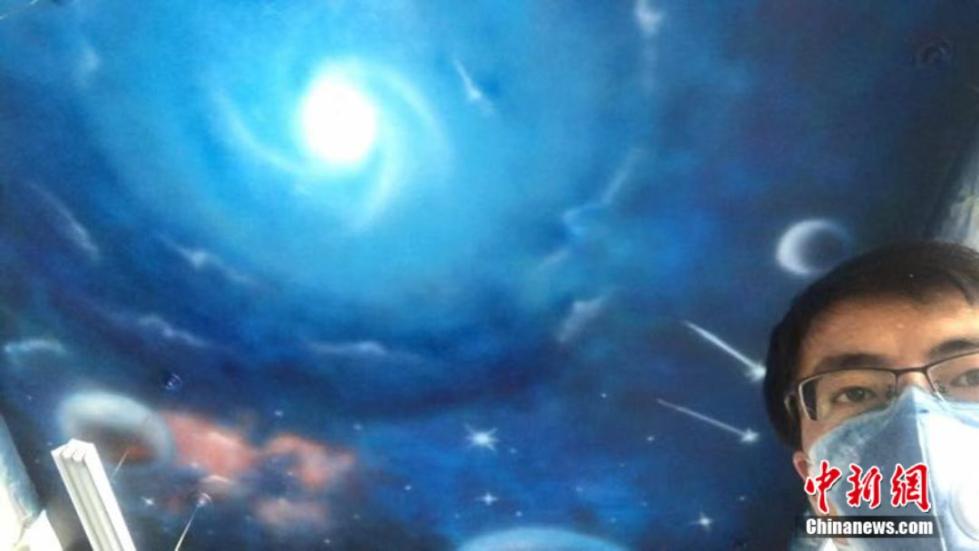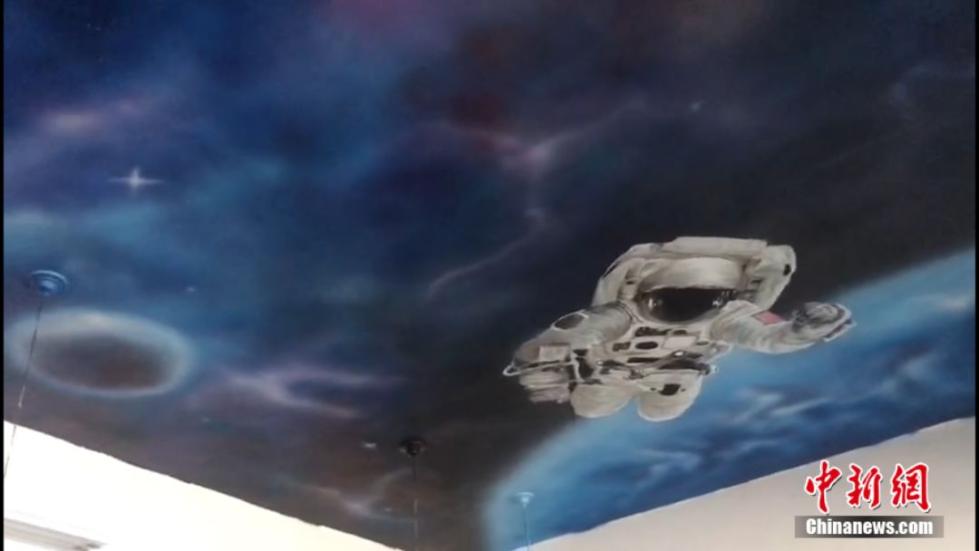 这幅在天花板上完成的星空图分为三个部分,一部分是由一个地球和一个黑洞组成,一部分是宇航员,还有一部分是一艘宇宙飞船。墙顶作画并不是一件容易的事,赵文瑞常常画到背心湿透。他说,“每次画画,下午胳膊就拿不起来,得用另一个胳膊推着这个胳膊去画 。”
