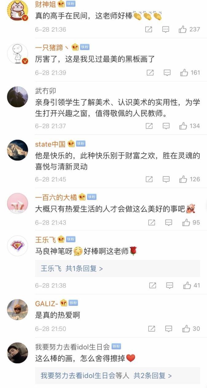 网友们纷纷留言称赞赵文瑞的粉笔画作品,说这样的作品犹如美景,老师们在画着这样优美作品的办公室里备课和批改作业,心情也轻松愉快。