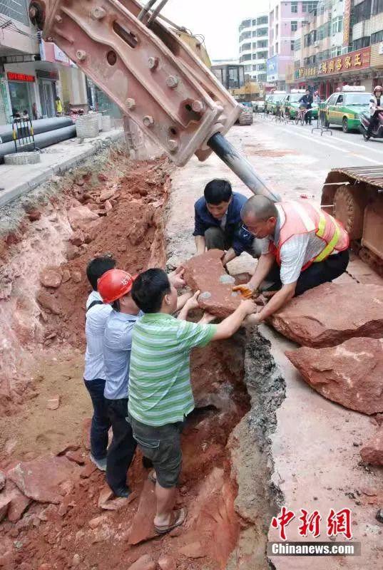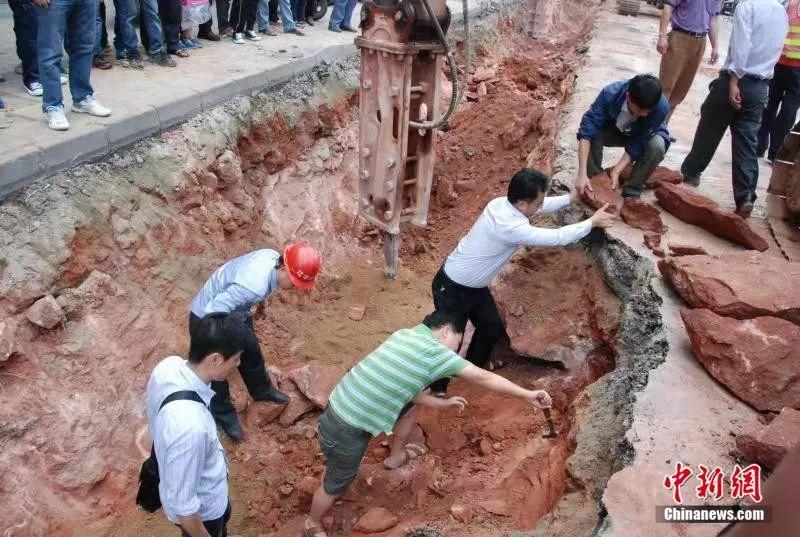 2015年4月,河源闹市一酒店门口修路挖出数窝恐龙蛋化石。河源恐龙博物馆供图